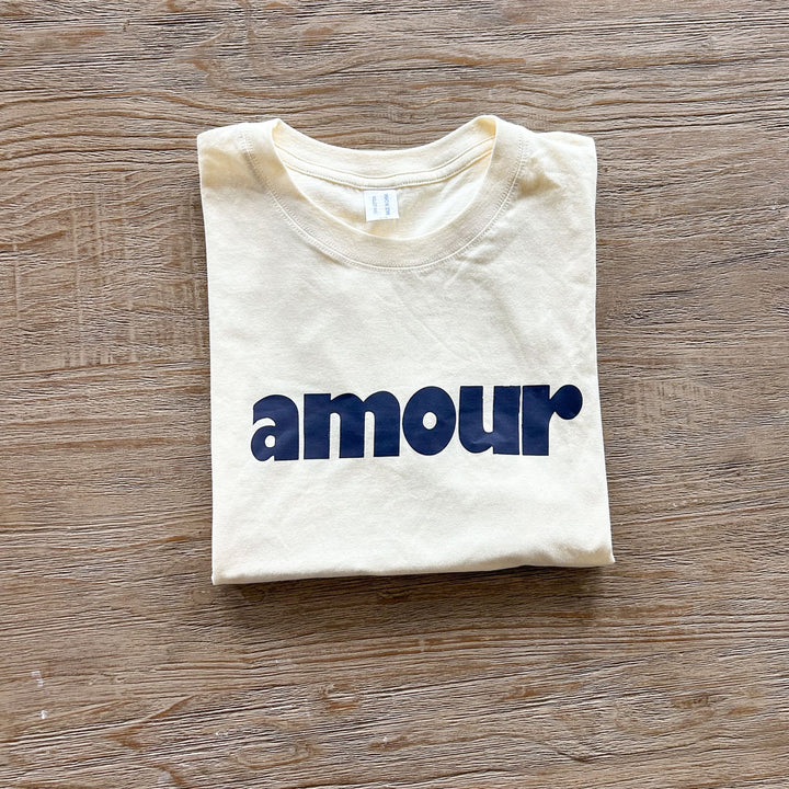 This apricot cotton tee strikes the perfect balance between comfort and style. Featuring a navy "amour" graphic that adds personality without overwhelming, the crew neck and short sleeves work beautifully on their own or layered under your favorite pieces.