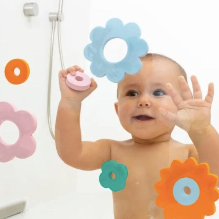 Bring playful fun to bath time with the Quut Flower Power Bath Puzzle! This retro-inspired set includes 10 large, soft EVA foam pieces that float and easily stick to wet surfaces. Kids can boost their fine motor skills by matching colours and rebuilding cheerful flowers on the tub or shower walls.
