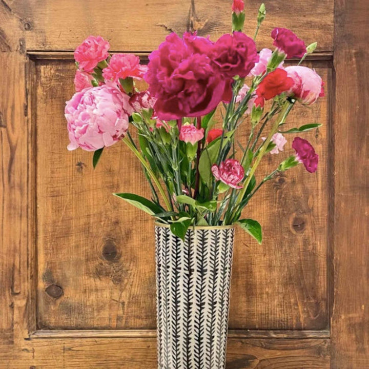Make a statement with this large enameled iron vase, printed with Bonnesoeurs’ signature “Thorns” design. Perfect for fresh or dried flowers, or as a standalone decorative piece that adds bold, contemporary flair to any room.
