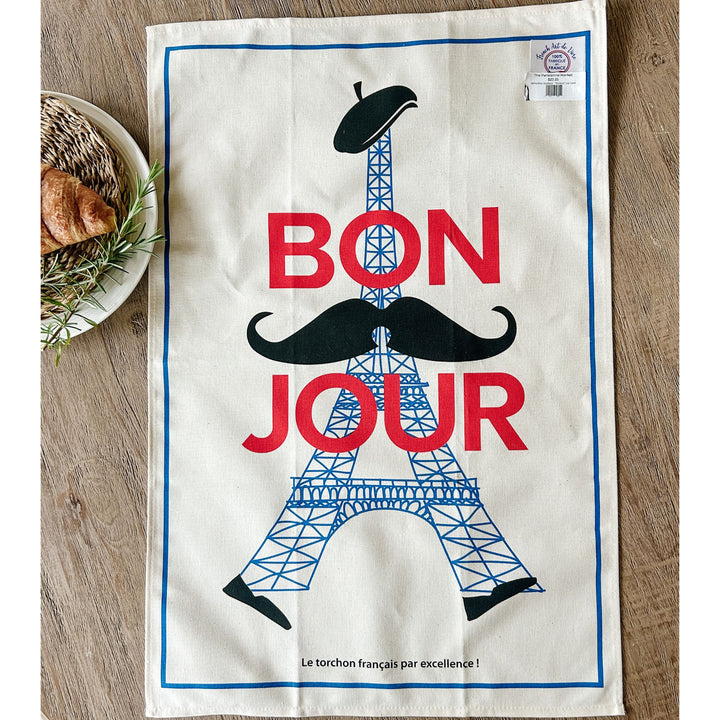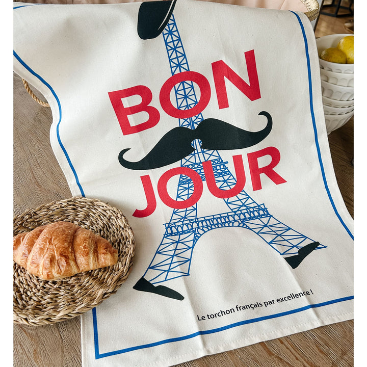 Say "Bonjour" with these French tea towels which are decorative and functional. They're great to wrap bread or to keep vegetables fresh longer. 48 x 72 cm (18.8" x 30.7") 100% Cotton - 220 gr/m2 heavyweight qualitative fabric. Made in France. Detailed illustrations are hand-drawn and silk-printed to preserve the brightness of the colours. The inks are water-based and contain no solvents or phthalates. Very good resistance to washing, light and rubbing.