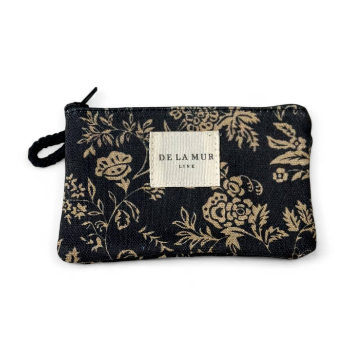 Coin purse with a zipper on top and a small black cord handle on the side. Made with fine fabric featuring a floral pattern in beige and black tones. Each item may have a variation in the pattern depending on where the piece was cut. Lined with thick grey fabric on the inside. For proper maintenance, it is advised to wash it cold by hand and not use a dryer.
