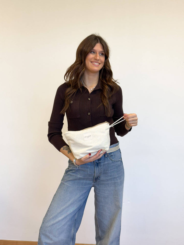 Toiletry bag with a zipper at the top and a cream-colored cord handle on the side. Made with thin half-panama fabric with shiny gold and silver lurex. Lined with thick gray fabric on the inside. For proper care, it is recommended to wash it by hand in cold water and not to use a dryer.