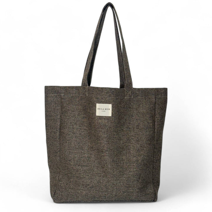 Medium-sized shoulder bag with handles, made from thick solid taupe fabric. For proper care, it is recommended to wash in cold water and avoid using a dryer.