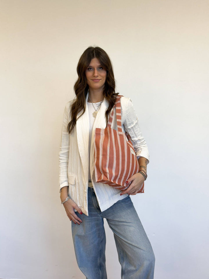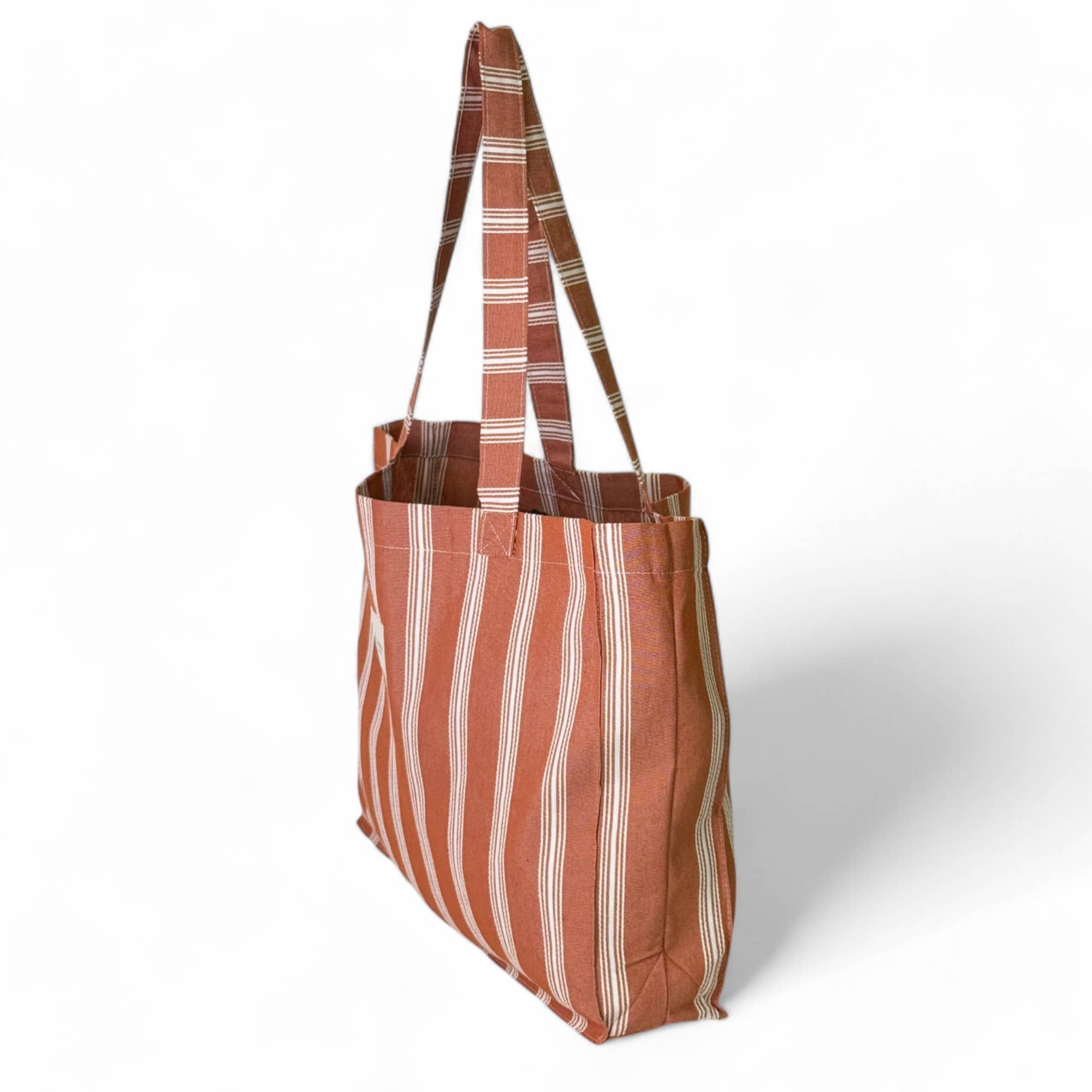 Made from lightweight fabric with off-white stripes on a rust-colored background.