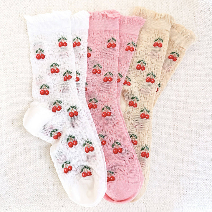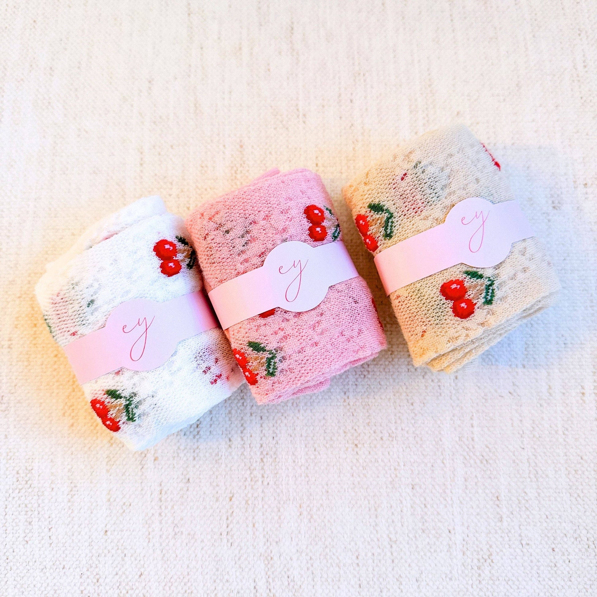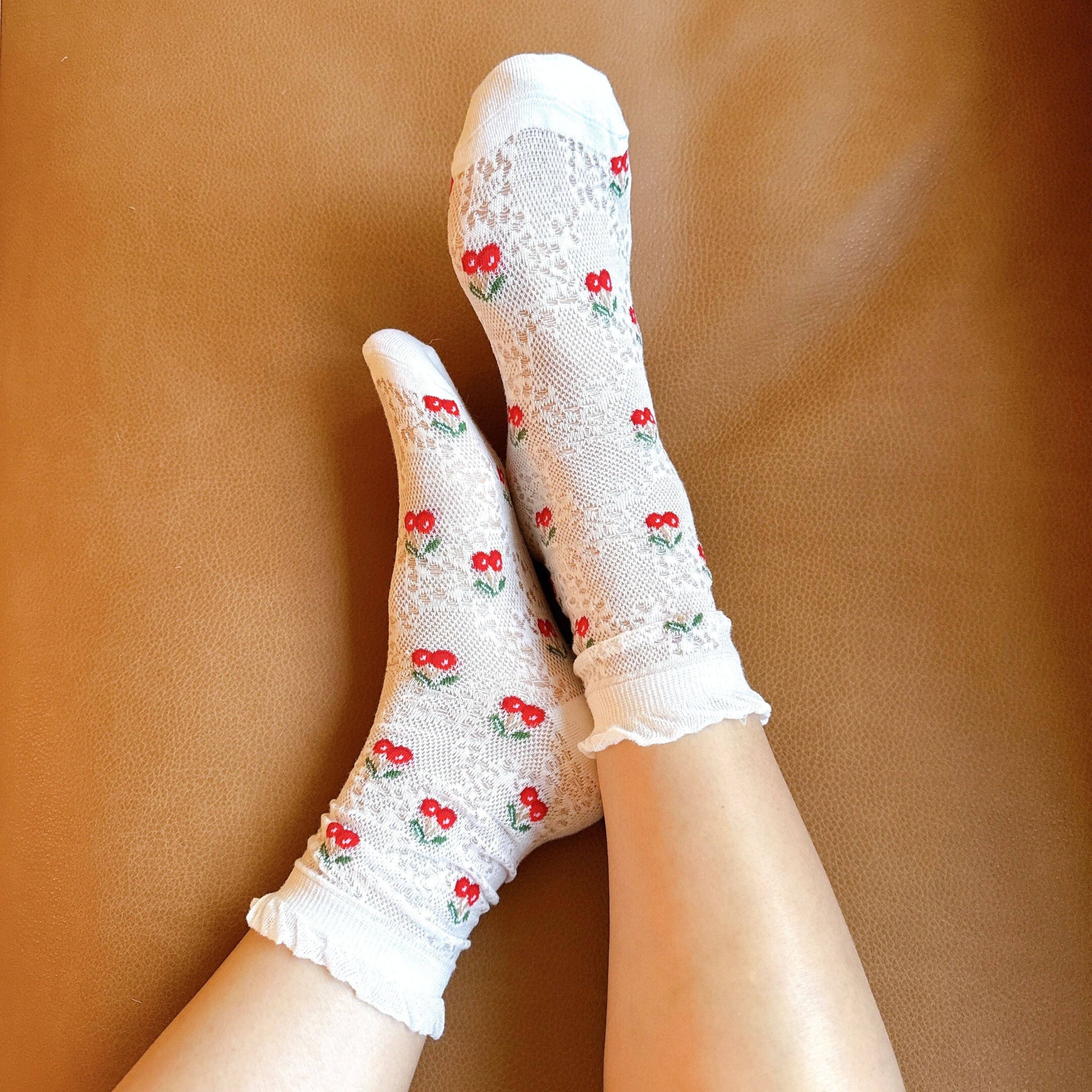 These socks feature a sweet and lovely cherry design that will add a touch of whimsy to any outfit. Not only are they stylish, but they are also comfortable to wear, making them a must-have for any sock lover. One size, generally fits 5-9.5 US women size 65% Cotton 35% Polyester Made in China