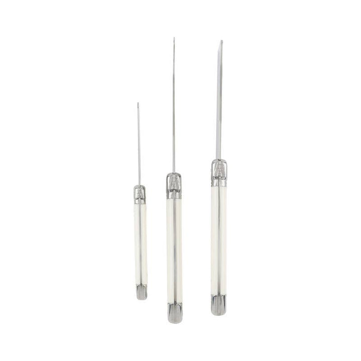 French Home's traditional and elegant Laguiole design with the iconic three rivet curved handle and bee emblem is comfortable to hold and perfectly balanced. The stainless steel knives cut effortlessly and are dishwasher safe. This three piece cheese set includes an 8.5" Cleaver, 9.25" Spear and 6.25" Spreader, perfect for serving a variety of cheeses. Laguiole is a town in France where this style of cutlery originated.