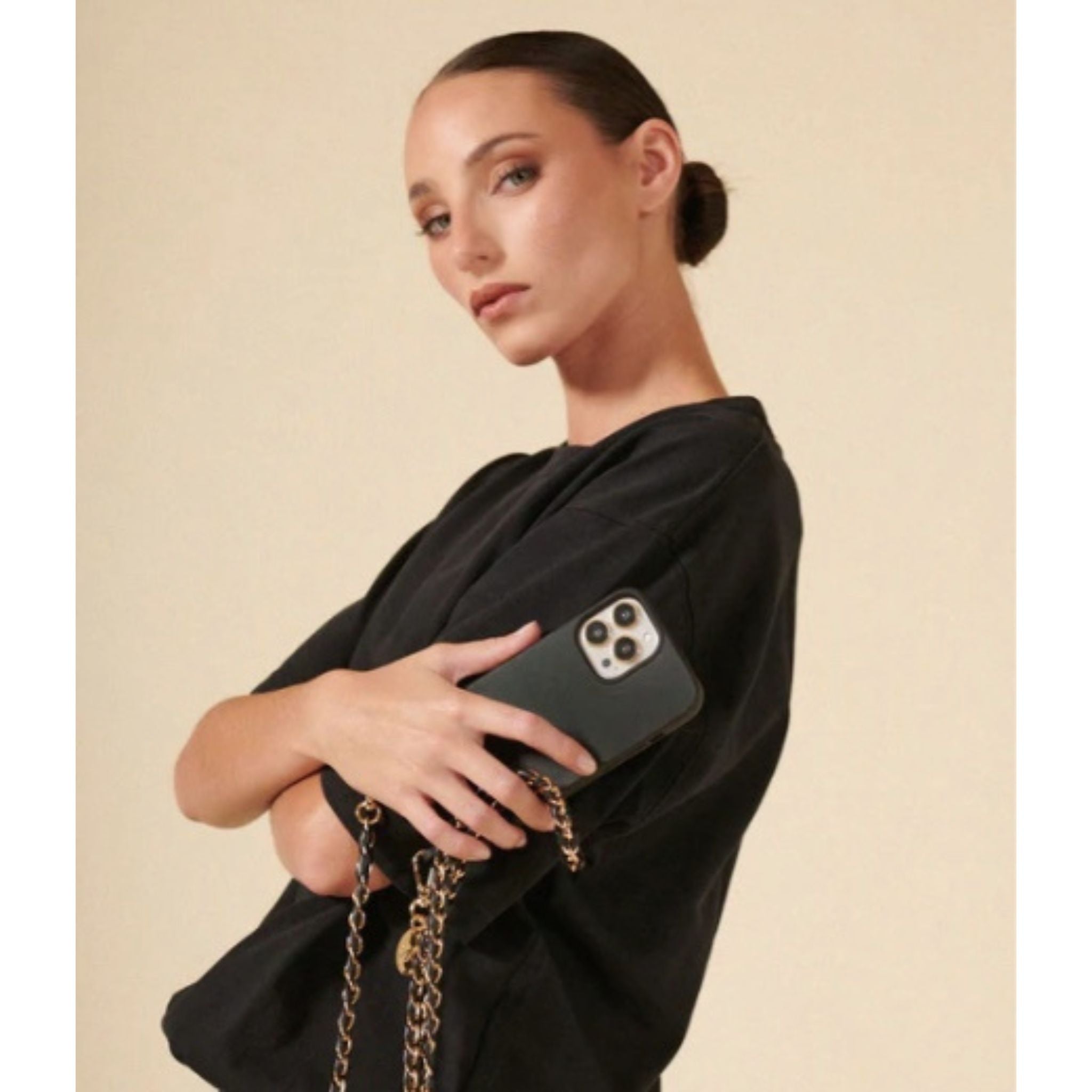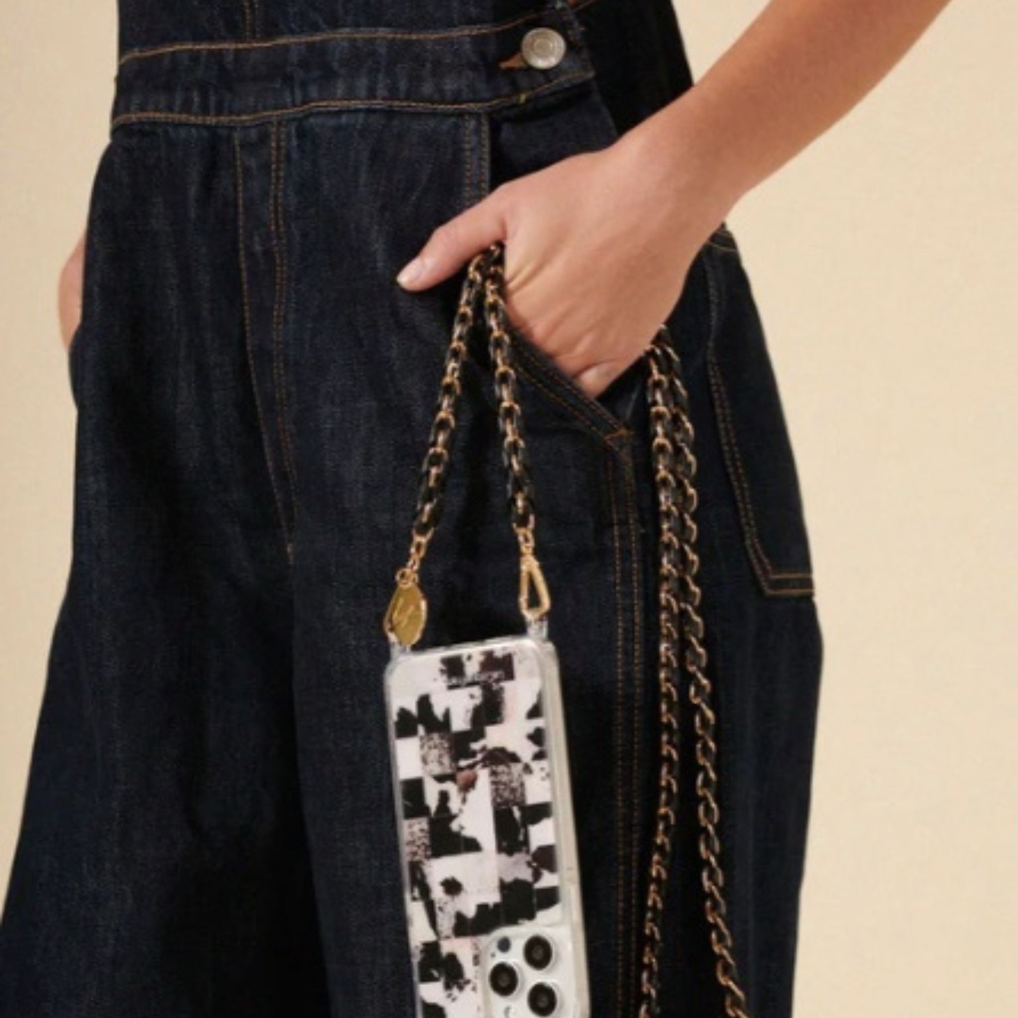 The Lou Phone Chain in Black and gold combines elegant design with everyday practicality. Crafted from durable vegan leather and metal, this 120 cm chain offers a stylish way to keep your phone secure and within reach. Lightweight yet durable, it’s perfect for wearing crossbody, on your shoulder, or by hand—elevating any outfit and giving you freedom of movement without sacrificing convenience. It clips easily onto ring cases or use a La Coque Francaise universal adapter with rotating carabiners. Comes with a recycled cotton pouch for easy storage and protection from dust.