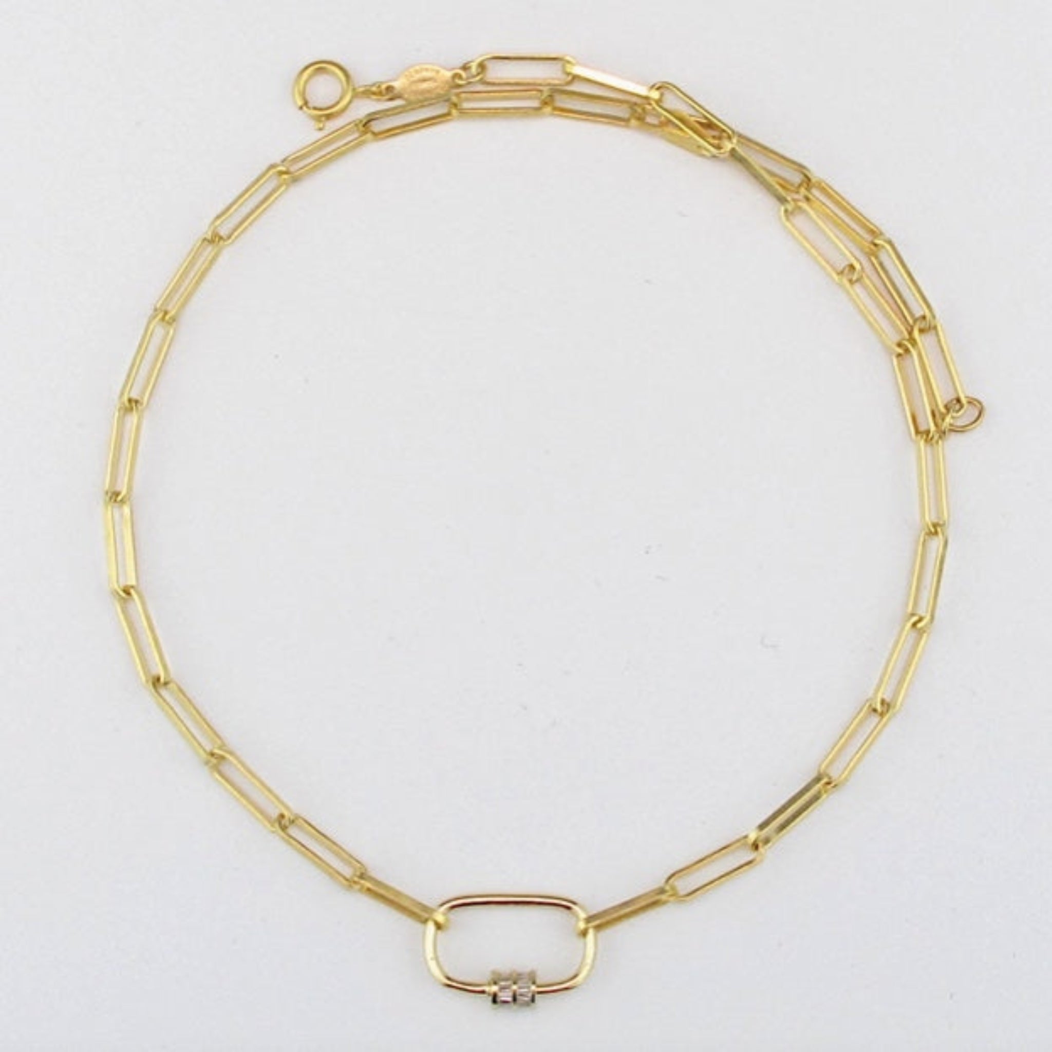 Elevate your style with this stunning crystal carabiner necklace, beautifully paired on a sleek paperclip chain. Finished in radiant 14k gold, it adds a touch of luxury and modern elegance to any outfit. Perfect for layering or wearing solo, this fashion-forward piece ensures you shine with effortless sophistication.