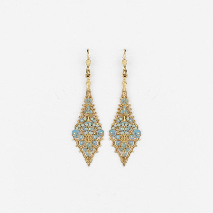 Historical filigree patterns enhanced by hand enameled details. Rendered from original French stamping and hand set with European crystals.