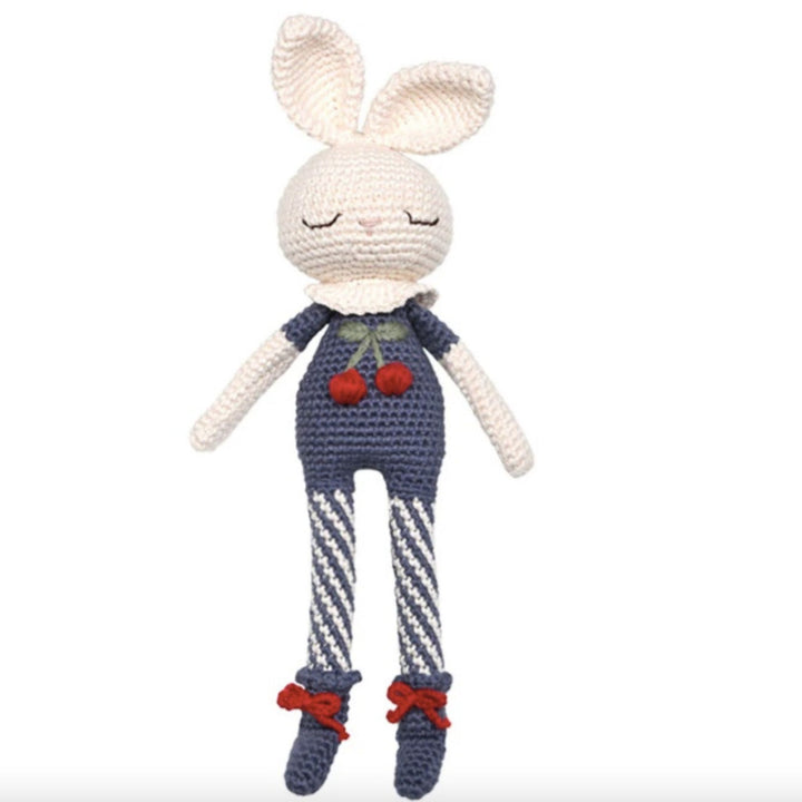 Meet Britney Bunny, dressed in indigo blue with delicate cherry blossom details. Hand-crocheted from pure organic cotton, she’s soft, safe, and perfect for cuddles and play. Her textured design encourages sensory development while supporting your baby’s growth and imagination.
