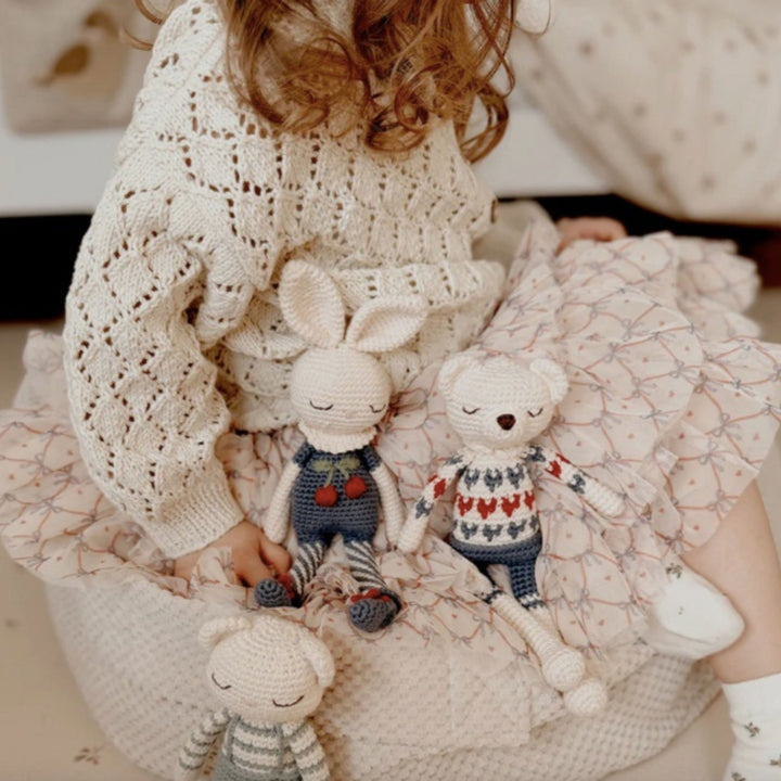 Meet Britney Bunny, dressed in powder pink with delicate cherry blossom details. Hand-crocheted from pure organic cotton, she’s soft, safe, and perfect for cuddles and play. Her textured design encourages sensory development while supporting your baby’s growth and imagination.