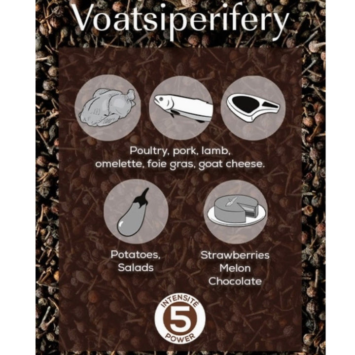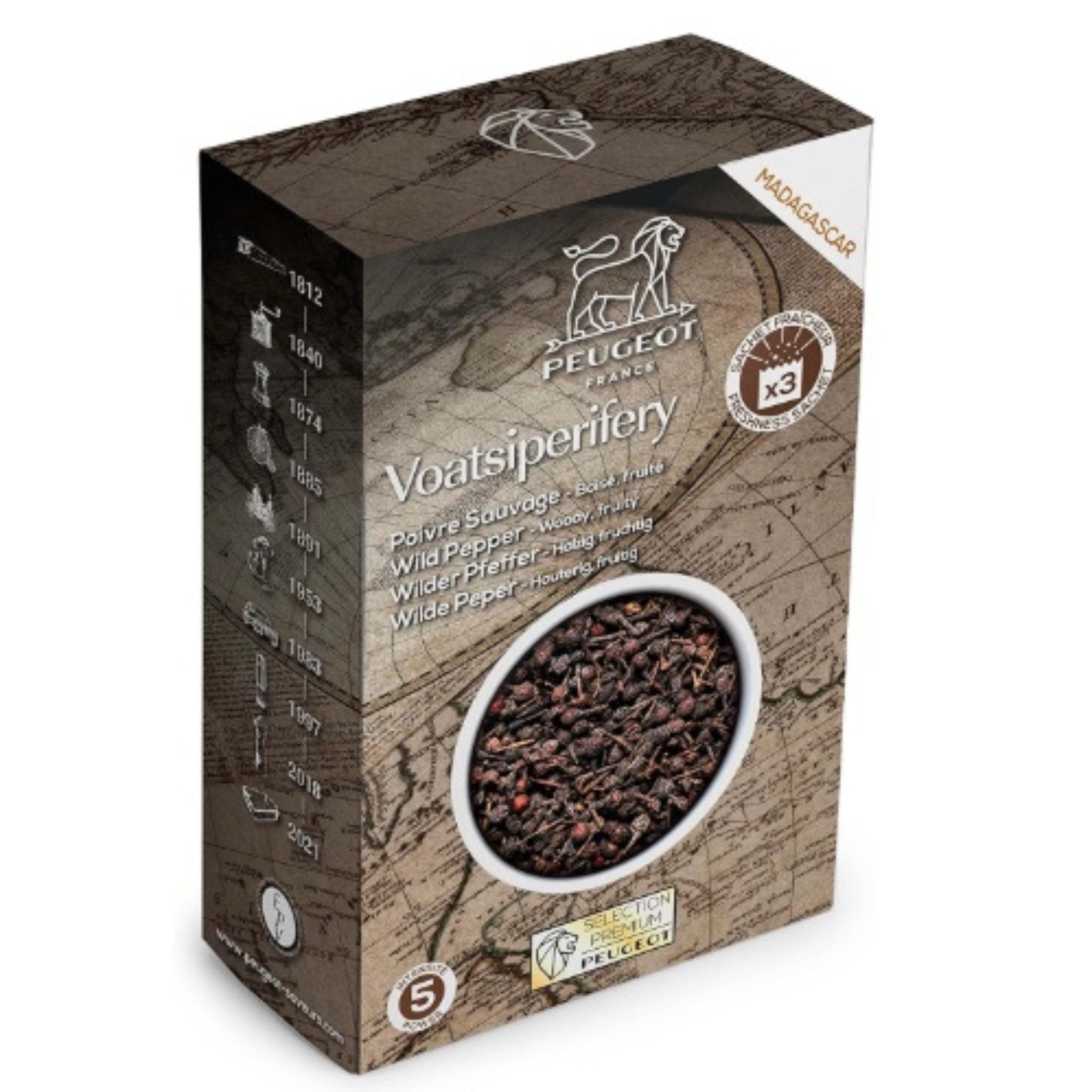 Discover the unique taste of Peugeot Voatsiperifery Wild Pepper, harvested from rare vines in southern Madagascar. These small peppercorns offer a delicate balance of woody, floral, and fruity flavors with just the right amount of heat. Perfect for enhancing meats, vegetables, omelettes, cheeses, and even desserts like strawberries and chocolate. Packaged in airtight Peugeot sachets, this premium selection maintains freshness while caring for the environment. Enjoy exceptional aroma and intensity with every grind, tailored for Peugeot mills at intensity level 5. Elevate your culinary creations with this exquisite wild pepper.