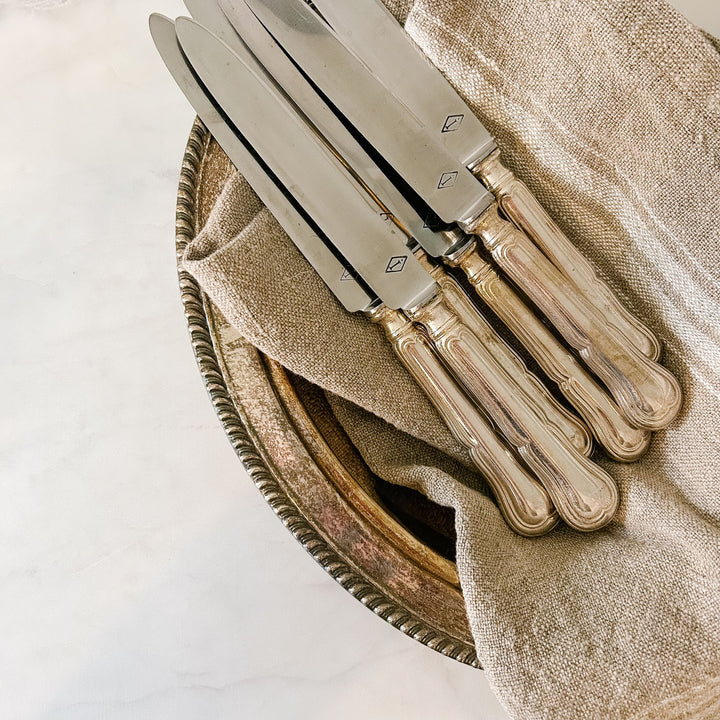 Bring Parisian sophistication to your table with this set of six vintage silver-stamped knives, sourced directly from the markets of Paris. Each knife features elegant French craftsmanship, with beautifully aged patina and detailed stamped silver handles that tell a story of timeless style. Perfect for collectors of French vintage flatware or anyone looking to add a touch of authentic Parisian charm to their dining experience.